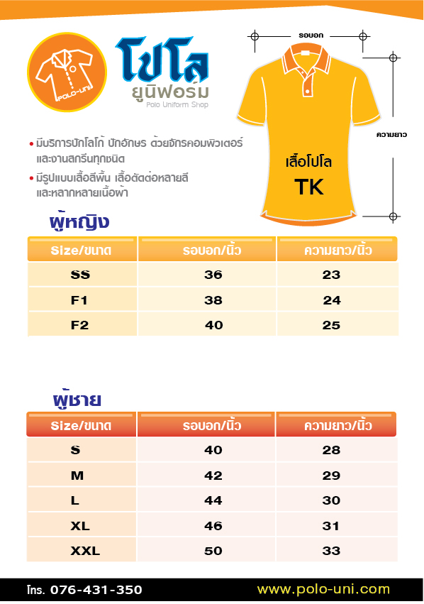 ขนาดเสื้อโปโล เนื้อผ้า TK